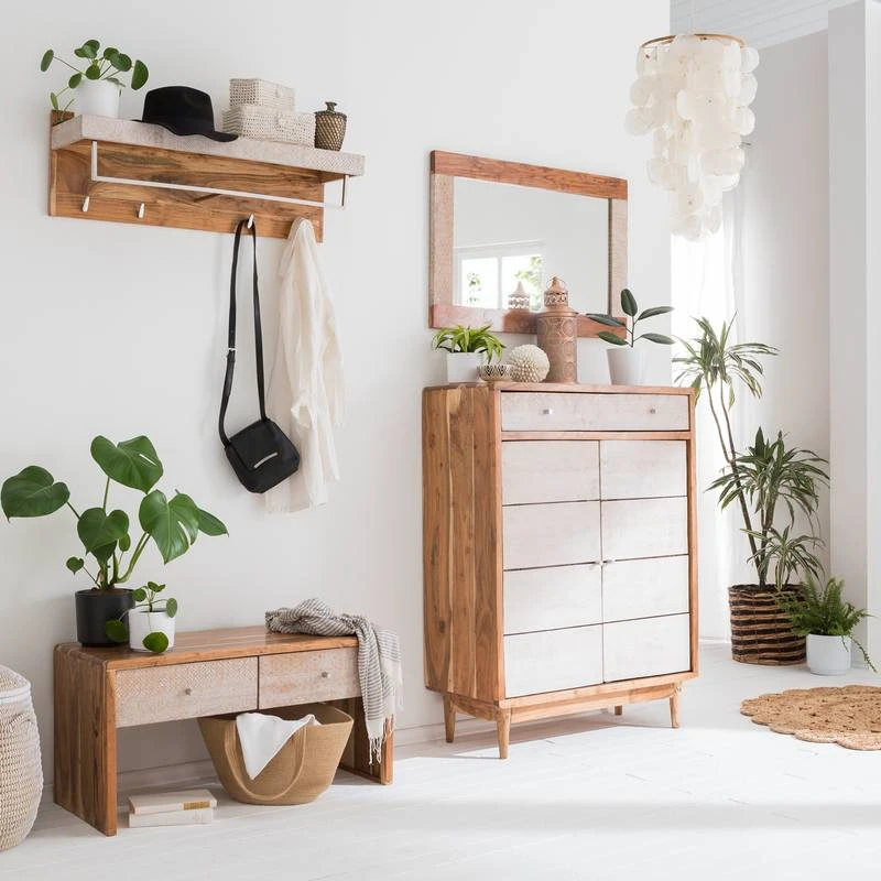 - Contenu de la livraison : 1 miroir, 1 meuble à chaussures, 1 porte-manteaux mural et 1 banc d’entrée, sans accessoires