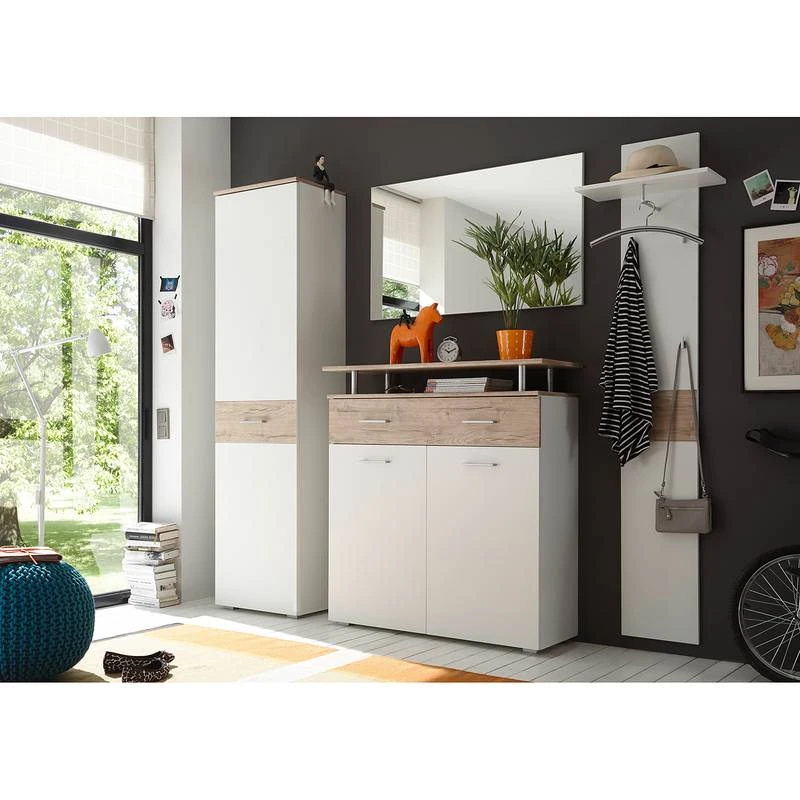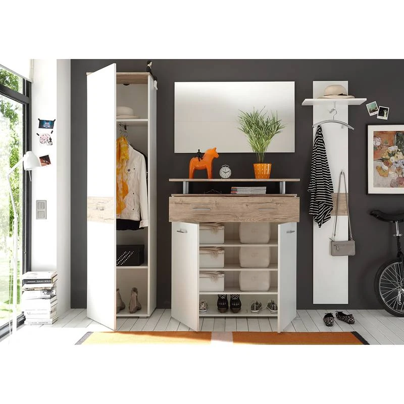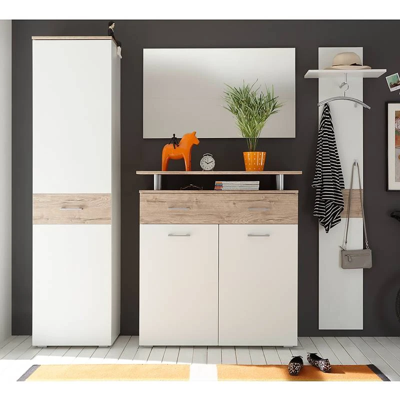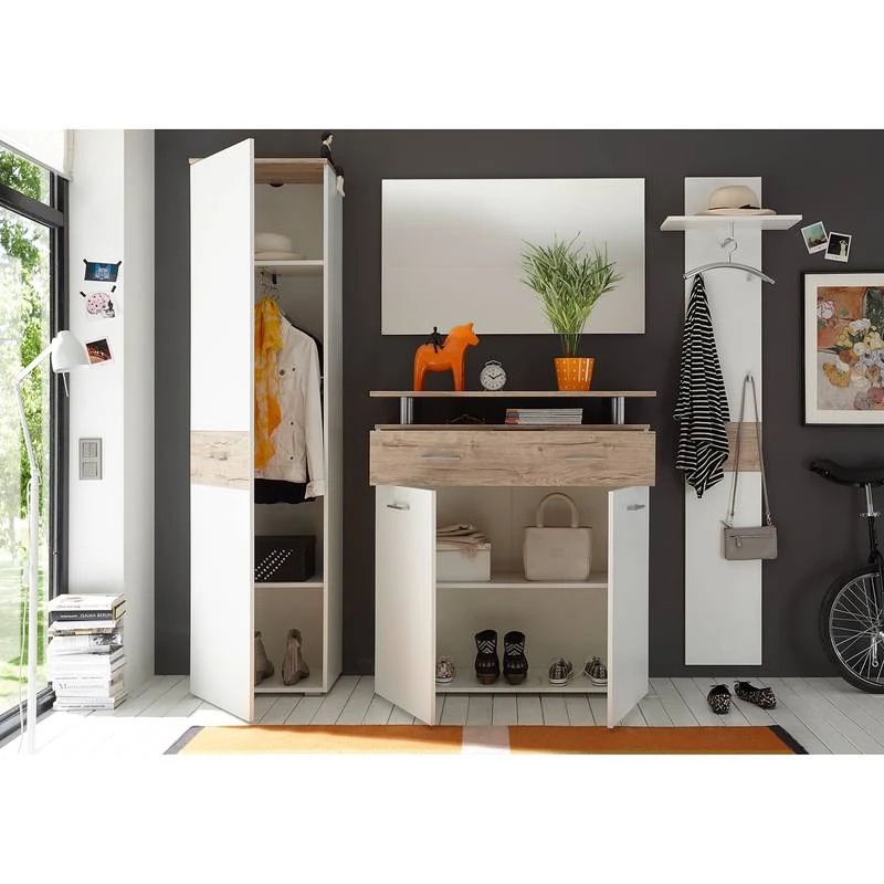- Contenu de la livraison : Ensemble d’entrée comprenant 1 armoire, 1 miroir, 1 meuble à chaussure et 1 porte-manteau mural, sans accessoires