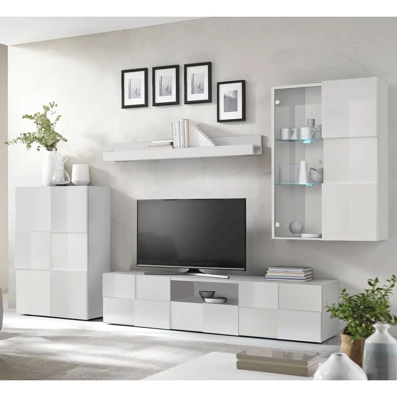 - Contenu de la livraison : Ensemble comprenant 1 buffet, 1 tablette murale, 1 meuble TV et 1 vitrine murale, sans éclairage ni accessoires