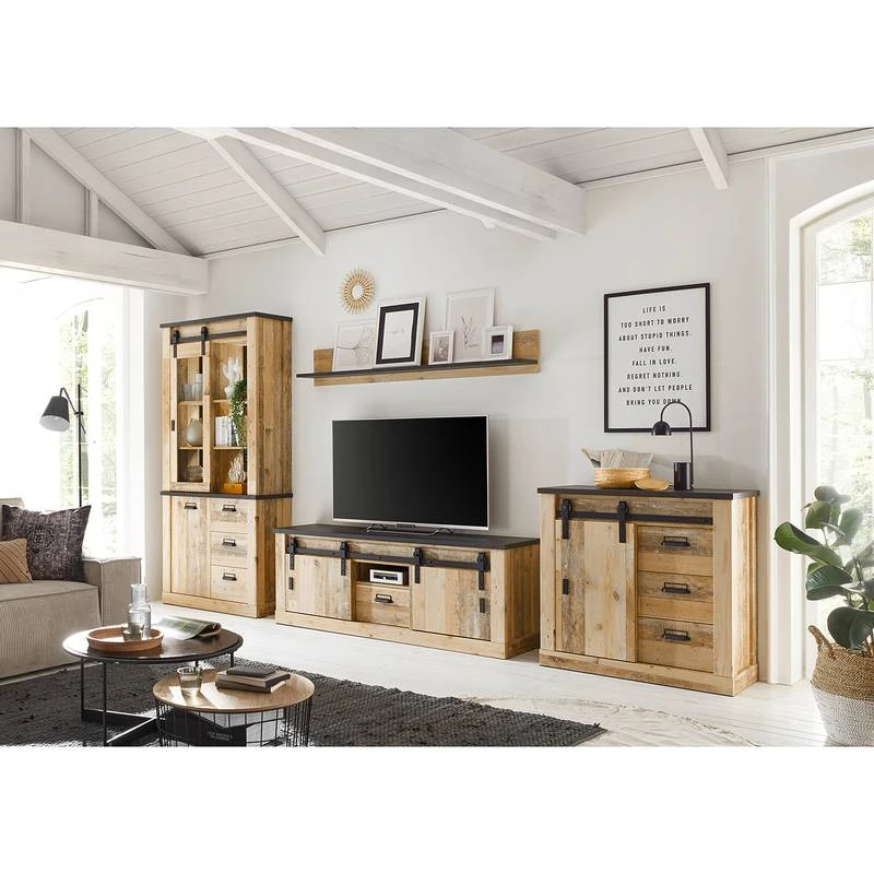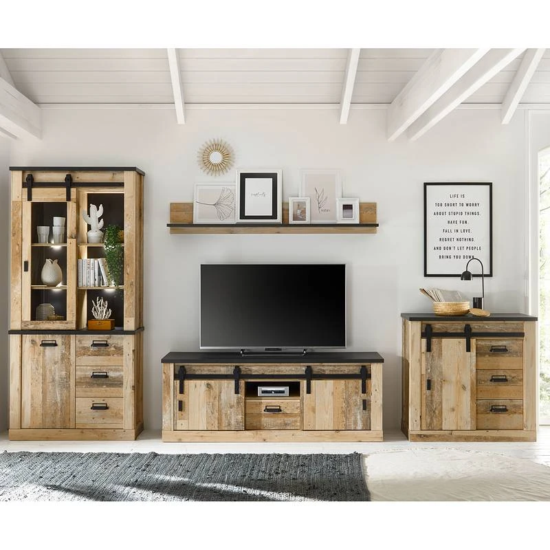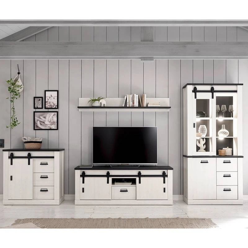 - Contenu de la livraison : Ensemble comprenant 1 vitrine, 1 tablette murale, 1 meuble TV et 1 buffet, sans éclairage ni accessoires