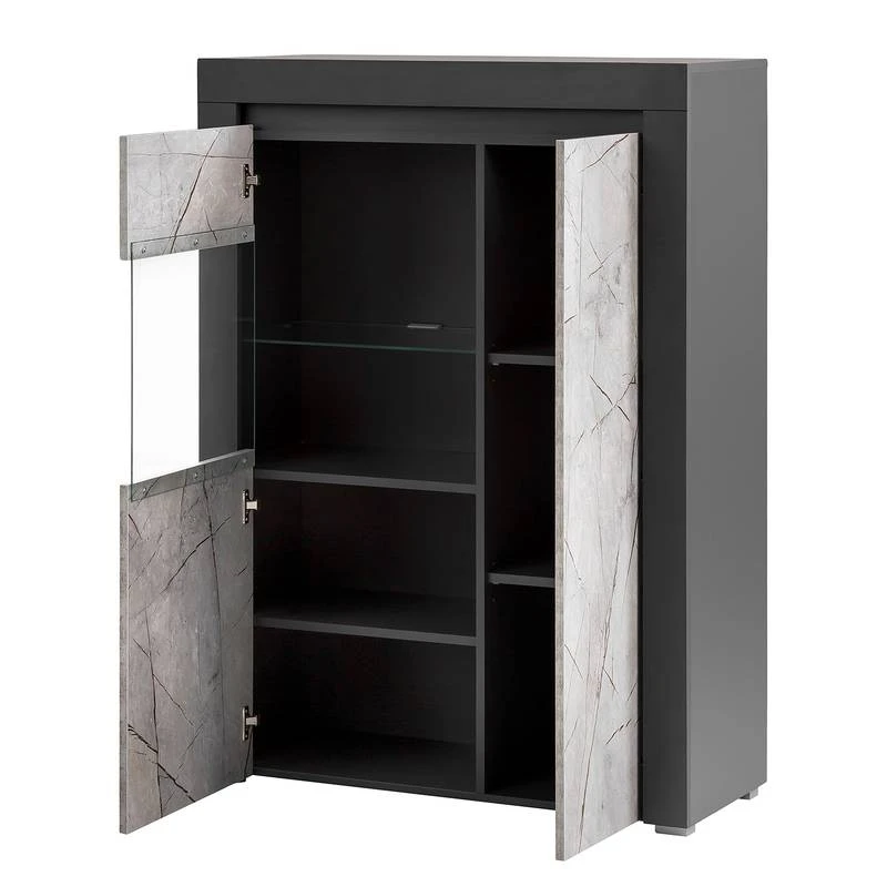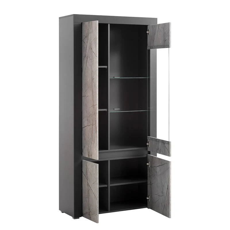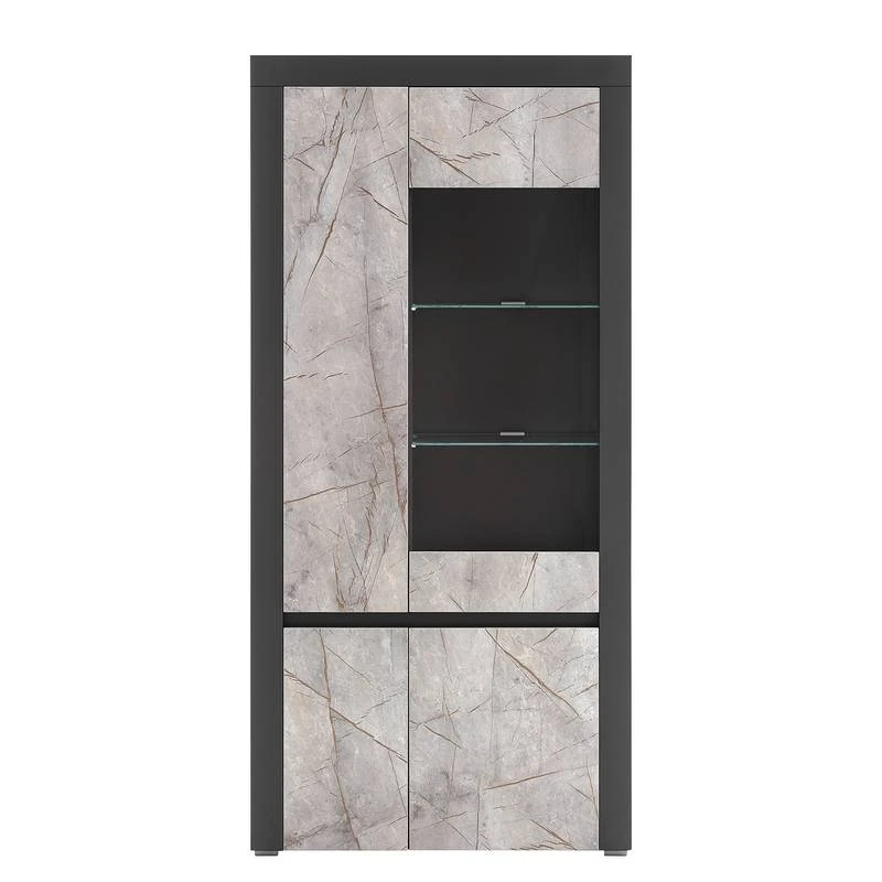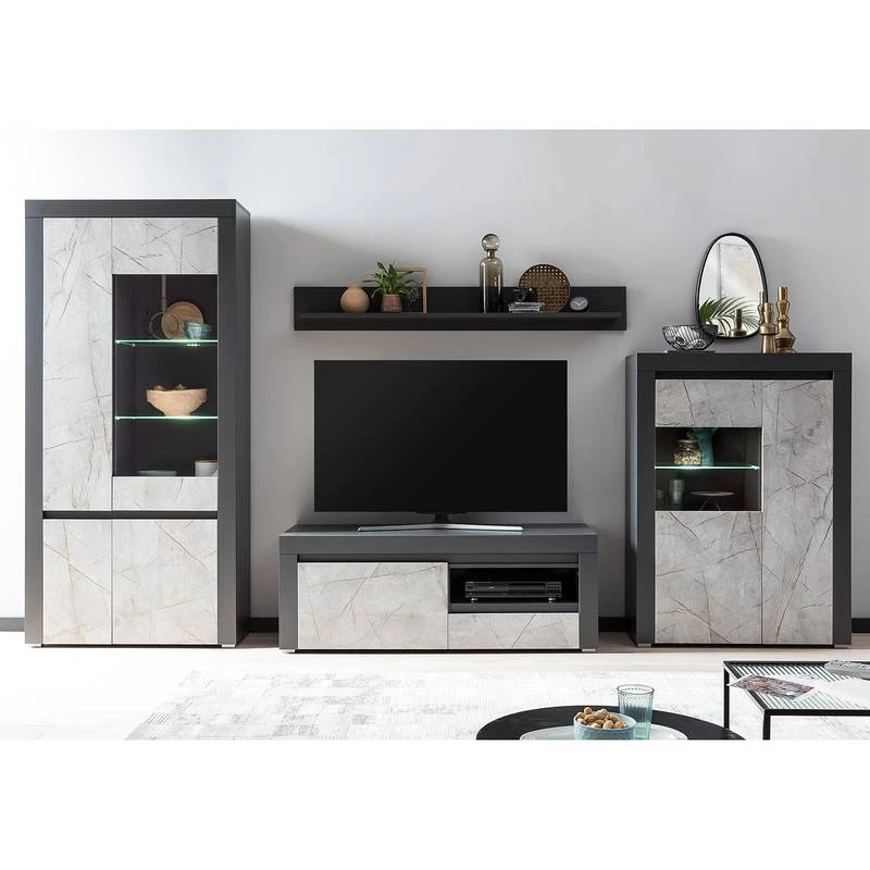 - Contenu de la livraison : Ensemble comprenant 1 vitrine, 1 tablette murale, 1 meuble TV et 1 buffet haut, sans éclairage ni accessoires